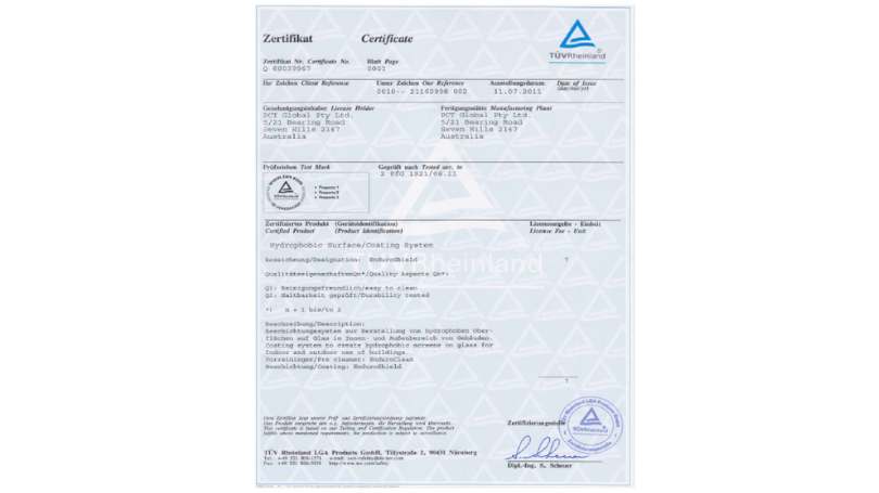 EnduroShield passed the following tests and was certified by TÜV Rheinland as Easy to Clean, and Durability tested: